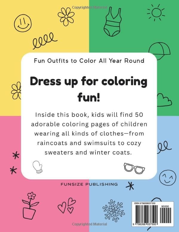 Bring creativity and learning together with the Clothing Styles Coloring Book for Kids. Designed especially for ages 3–8, this book features 50 simple, adorable coloring pages of children wearing outfits for every season. From raincoats and swimsuits to cozy sweaters and winter coats, kids will explore clothing styles while having fun.